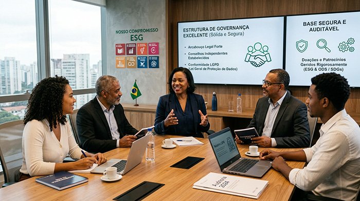 Nascemos com uma estrutura de governação de excelência. A nossa modelagem jurídica, a formação de conselhos independentes e a adequação à Lei Geral de Proteção de Dados (LGPD) já estão estabelecidas. O terreno está totalmente seguro e auditável para garantir que cada doação ou patrocínio seja gerido com rigor e alinhado aos critérios ESG e aos Objetivos de Desenvolvimento Sustentável (ODS) da ONU.